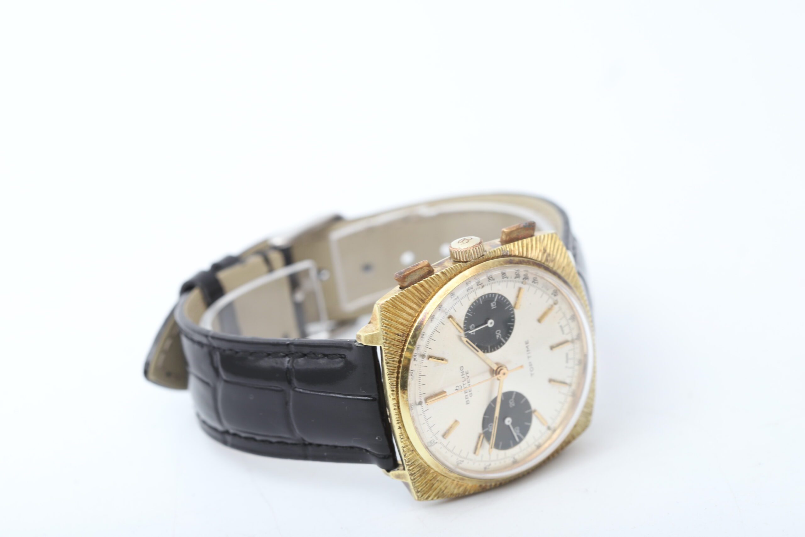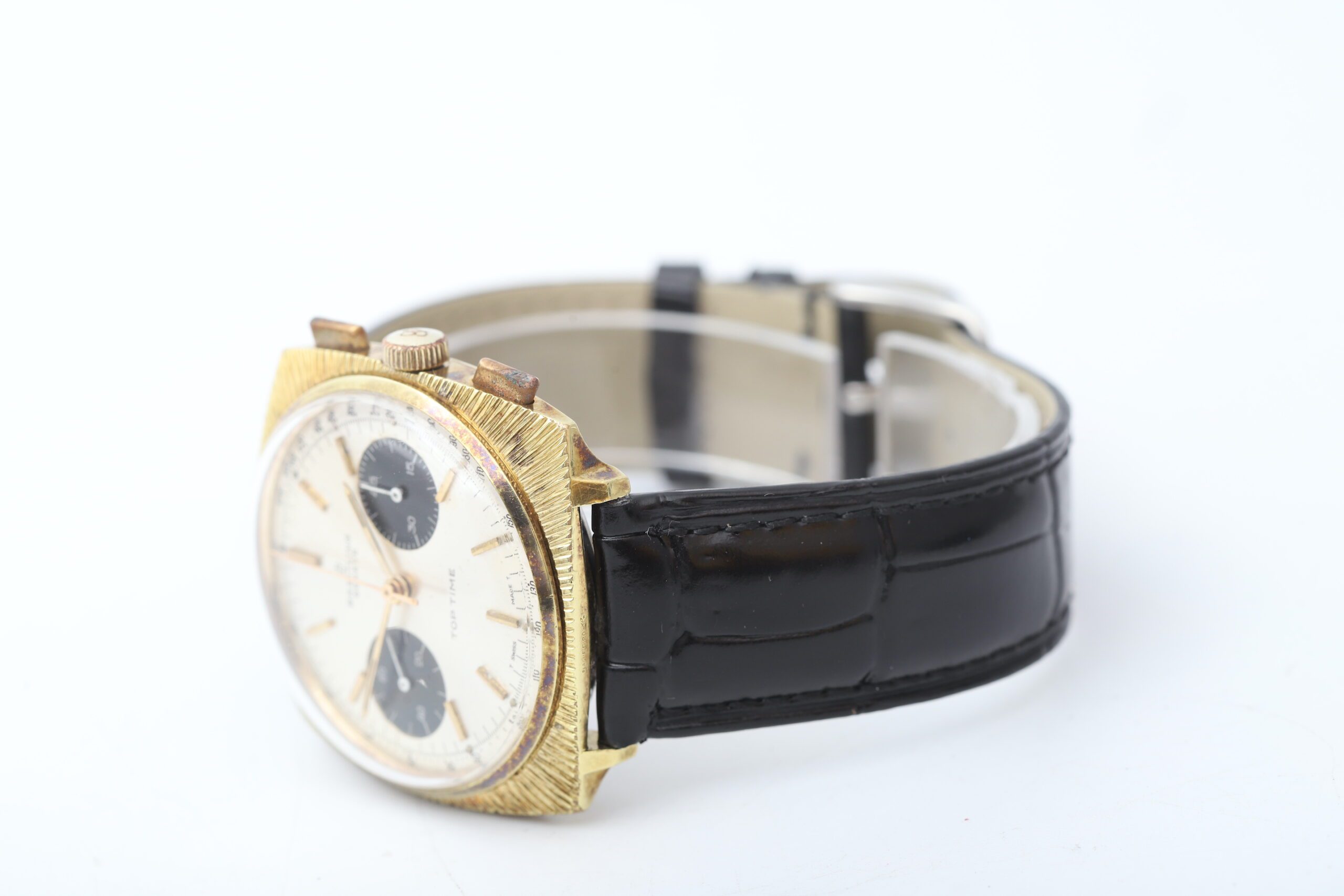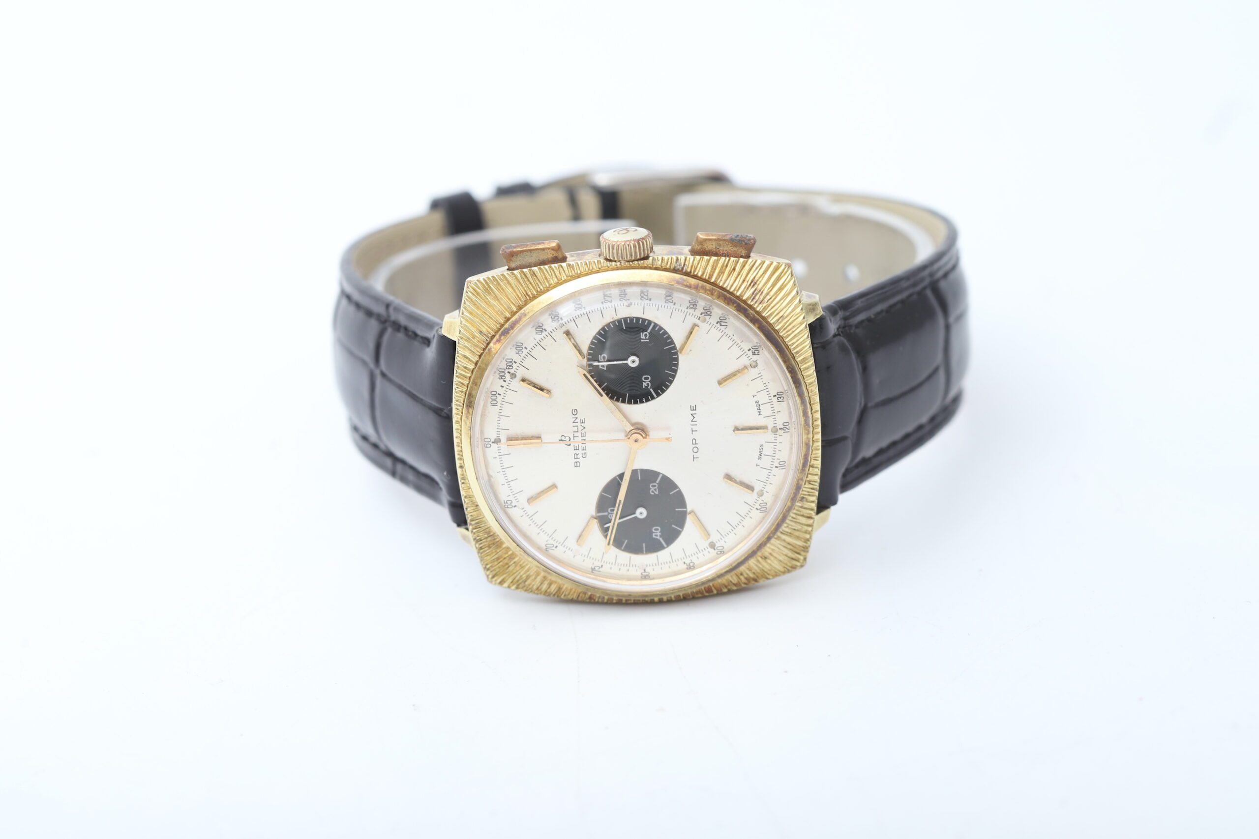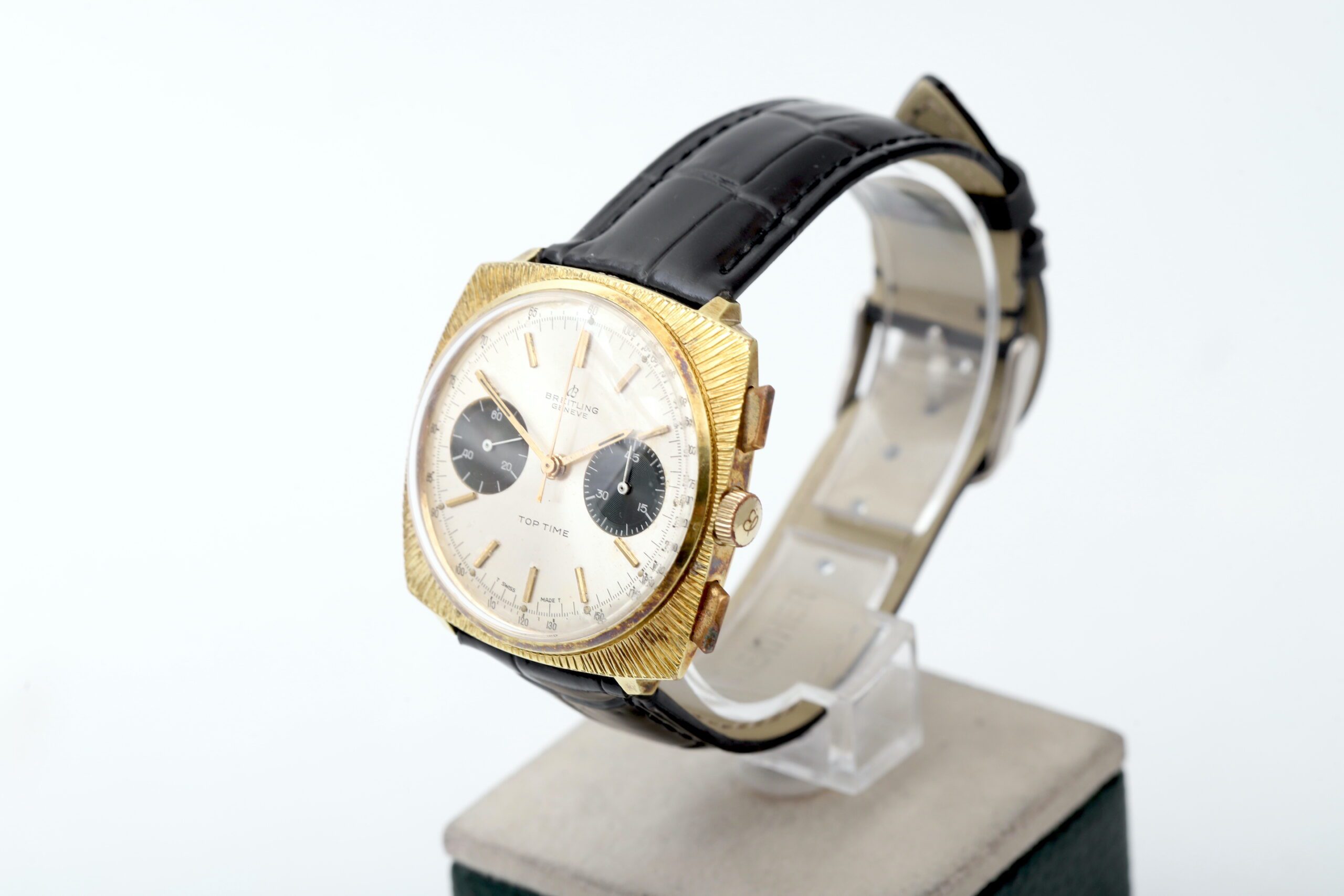 Embrace vintage charm! The Breitling Top Time 2009 (Ref. 2009) is a men s watch that exudes retro flair with sophisticated functionality. This remarkable 1966 timepiece features a classic 36mm stainless steel and gold-plated case and bezel, a striking panda dial with chronograph functions, a reliable manual-wind movement for a classic watch experience, and a black leather aftermarket strap for a touch of modern flair.