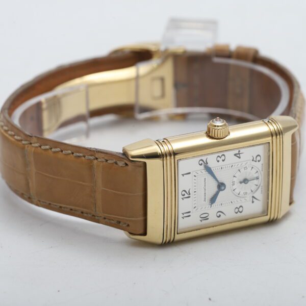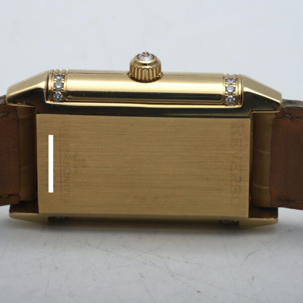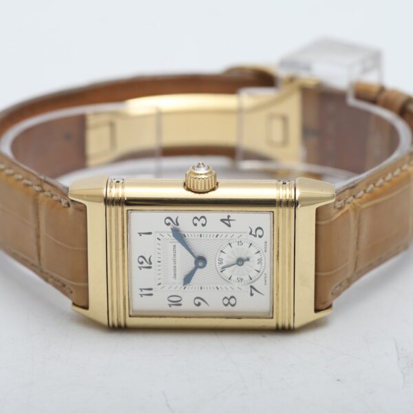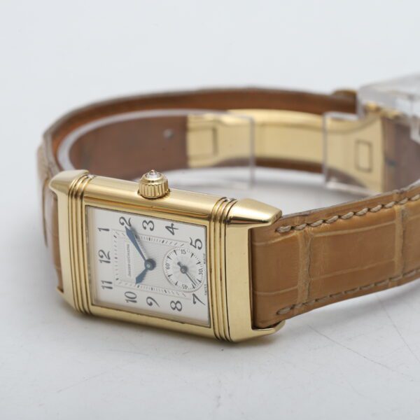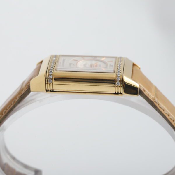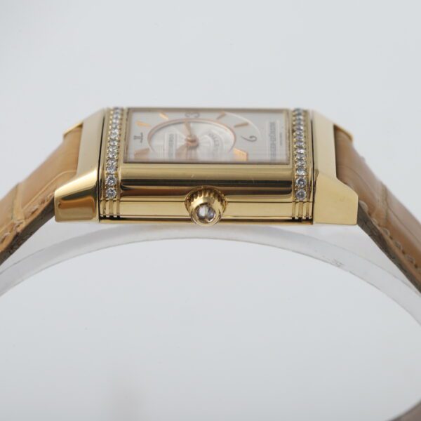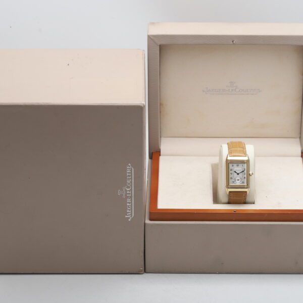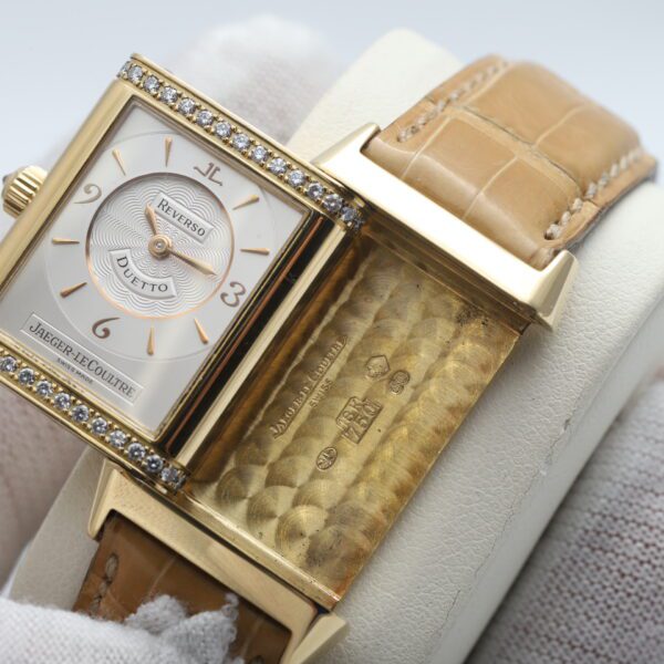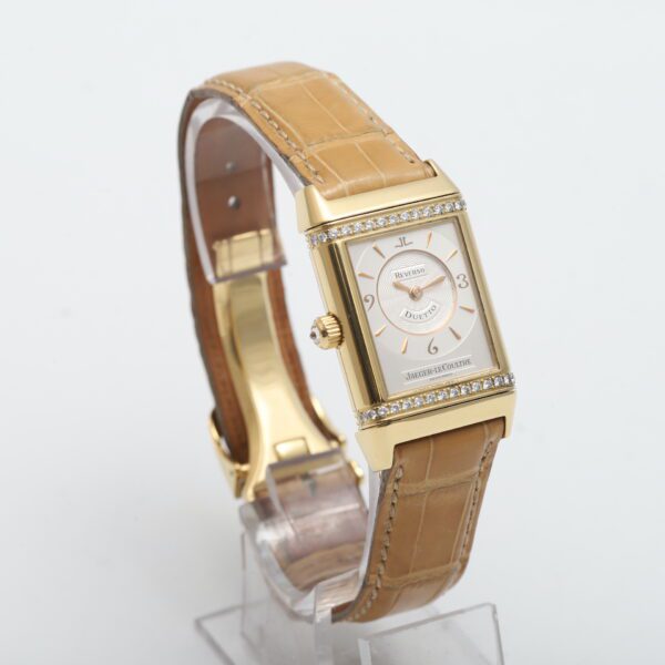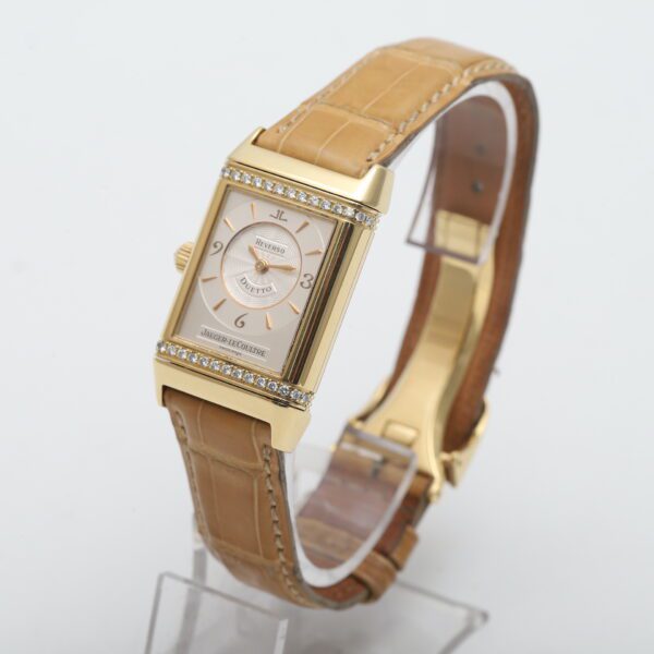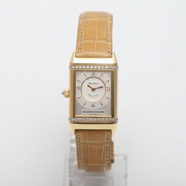 Experience the timeless artistry of the Jaeger-LeCoultre Reverso Classique Duetto (256.1.75)! This 2005 timepiece showcases the ingenuity of the Reverso design with two distinct faces, housed within a luxurious 18ct yellow gold case. One side boasts a dazzling factory diamond-set bezel, while both sides feature elegant white dials, making it a versatile and sophisticated statement piece for the modern woman.
