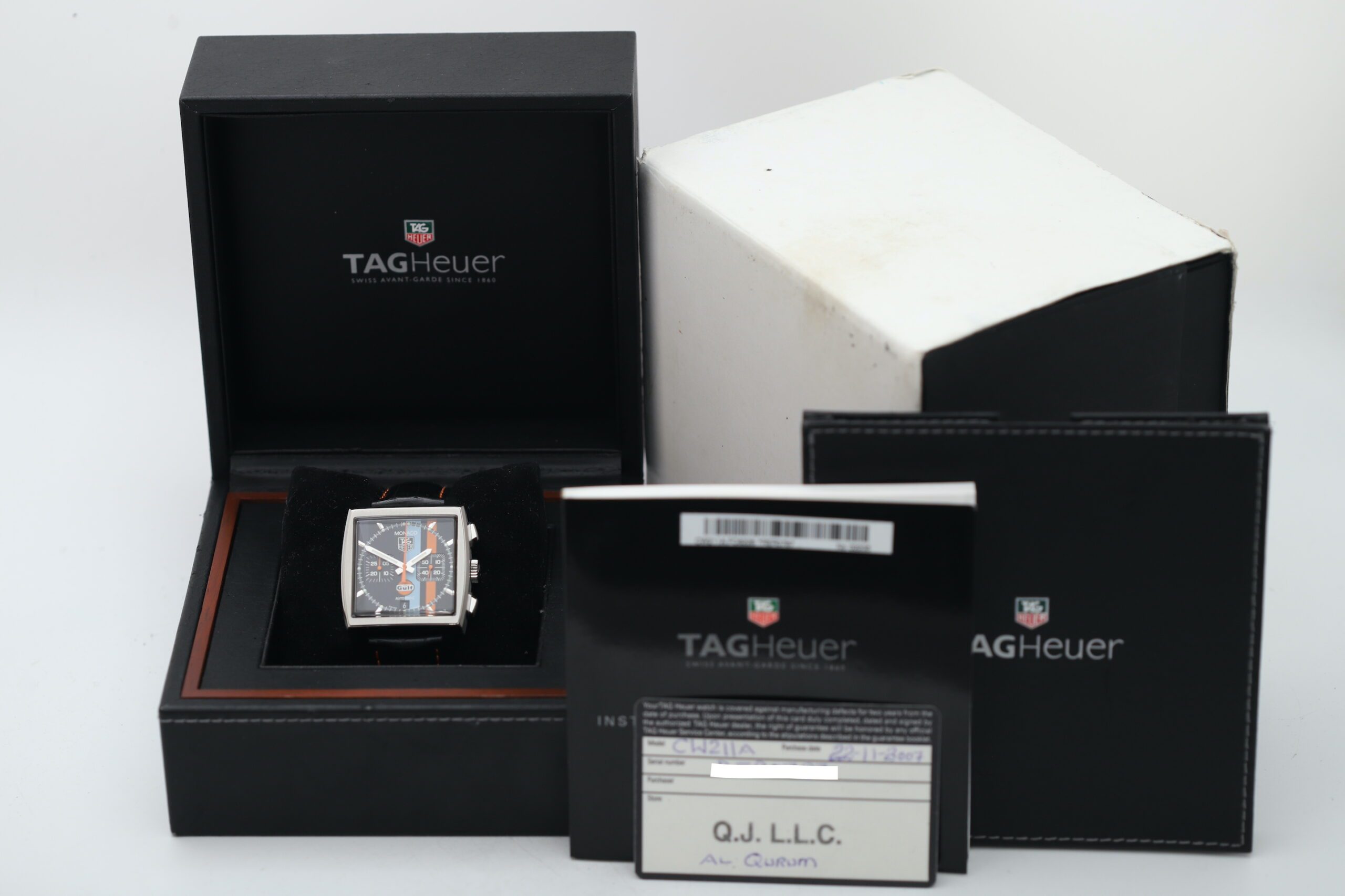 Channel the spirit of Formula 1 legends with the TAG Heuer Monaco Gulf Limited Edition (reference CW211A.FC6228). This exceptional 2007 timepiece, limited to only 4,000 pieces, celebrates TAG Heuer’s rich heritage in motor racing and partnership with Gulf Oil.
