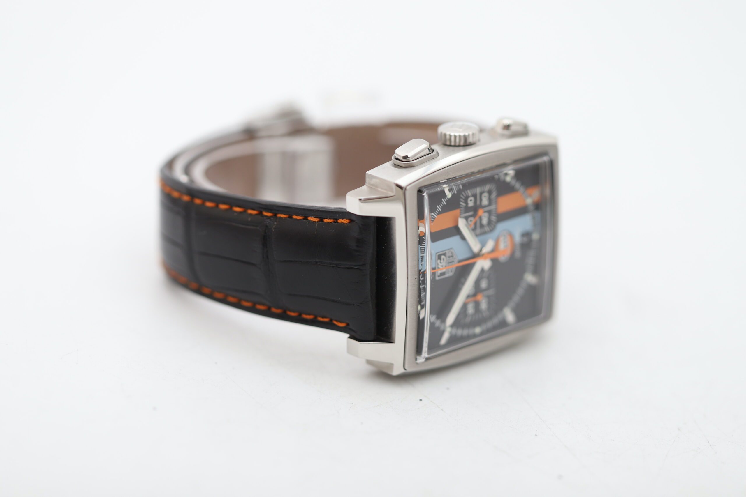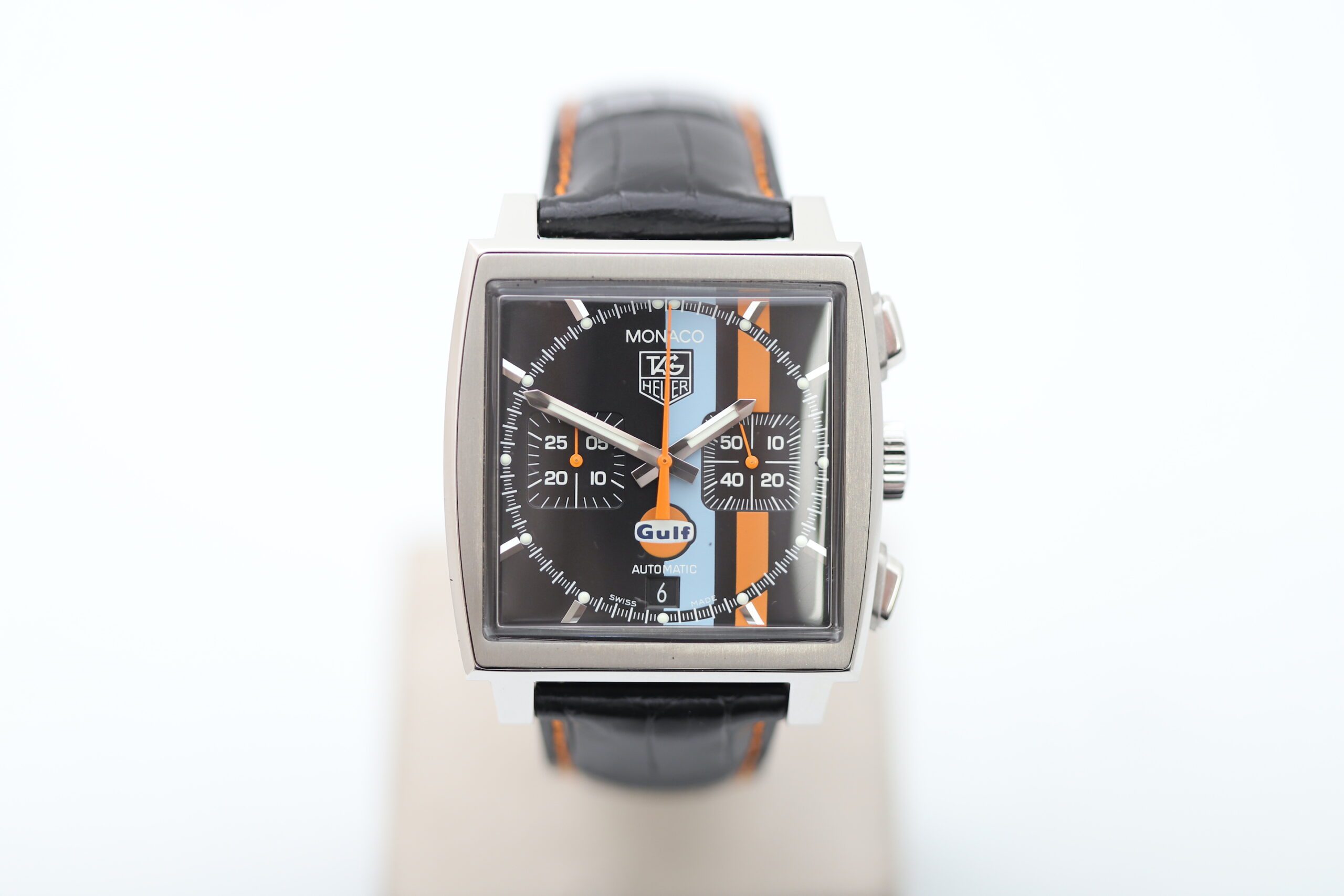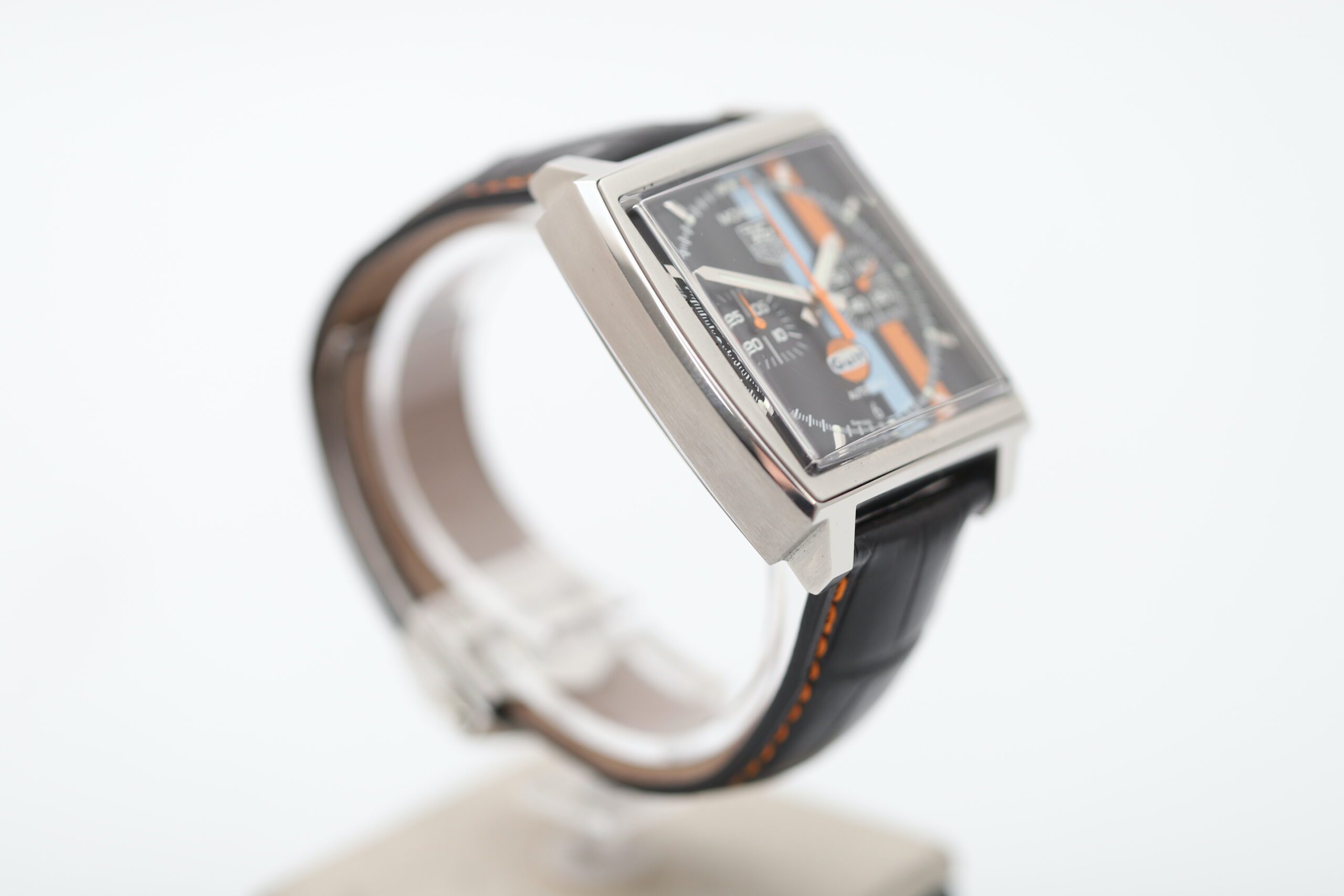 Bold Blue & Orange Gulf Stripes: A signature design element, paying homage to TAG Heuer’s motorsport legacy.